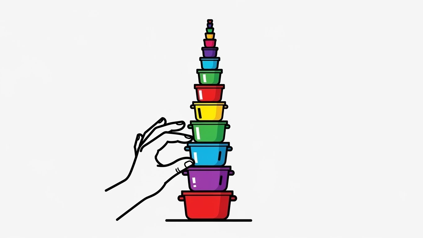 Os Potinhos de Empilhar e Rolar são imbatíveis. Eles exigem precisão para empilhar e encaixar, trabalhando a musculatura fina das mãos e o raciocínio espacial.